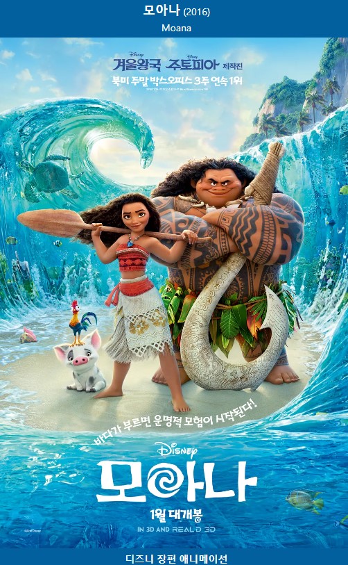 두 번째 추천 영화는 **"모아나(Moana)"**입니다. 저도 좋아하는 영화인데요, 이 영화는 바다를 탐험하며 자신의 운명을 찾아가는 소녀의 이야기를 담고 있습니다. 아름다운 애니메이션과 함께 흥미진진한 모험이 펼쳐지며, 아이들뿐만 아니라 어른들에게도 큰 인기를 끌었습니다. 가족 모두가 함께 즐길 수 있는 모험과 감동이 가득한 영화입니다.
