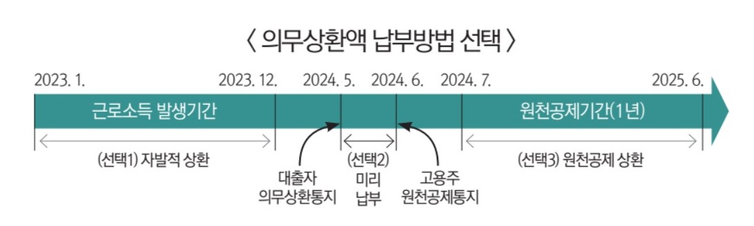•원천 공제 대상자:근로소득자,퇴직소득자,연금소득자,보험모집인,방문판매원으로 연말 정산 하는 사업소득자 1. 매월 원천공제 납부 -원천 공제 (7월~다음 해 6월)가 시작되기 전 대출자(5월) 및 고용주(6월)에게 각각 통지 <고용주는 대출자에게 급여지급 시 의무 상환액을 원천 공제하겨 다음 달 10일까지 상환금 명세서에 의하여 상환 내역을 신고 및 납부> 2. 원천공제 미리 납부 -원천 공제 대상자를 통지하기 전 :원천 공제 1년분 상환액을 일시 또는 분할하여 미리 납부 <고용주에게 원천 공제 대상자로 통지되지 않음> :1년분 미리 납부:5월 말까지(1년분) 일시 납부 분할 납부:5월 말까지 나머지 50% 는 11월 말까지 납부 3. 원천 공제 개시 도중 잔여액 납부 -매월 원천공제하여 납부하던 중이라도 원천공제 통지액에서 이미 납부된 상환액을 차감한 잔여액은 일시에 납부 가능, 잔여액 납부 시 고용주가 원천공제를 중단함 •고지, 납부 대상자 -종합, 양도소득 또는 상속, 증여 재산이 발생한 경우 신고된 국세소득금에 따라 의무상환액을 계산하여 대출자에게 납부고지서 발송(대출자는 납부 고지서에 기재된 가상계좌로 납부만 허용) -납부 방법:납부 고지서의 가상계좌로 납부 ※납부 시간:평일 09:00~21:00(토· 일· 공휴일 제외) •자율상환제 -근로 및 사업 소득이 있는 대출자가 소득이 발생한 연도에 미리 자발적으로 상환하면 해당 소득에 대해 다음 해 부과될 의무 상환액을 납부한 것으로 인정(2018.3.13 시행)