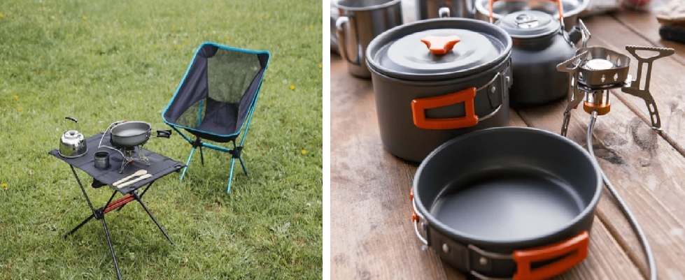 ~캠핑용 냄비, 프라이팬: 간단 찌개, 볶음요리, 라면등 간편하게 조리할 수 있는 캠핑용으로 가볍고 휴대가 간편한 조리 도구를 준비하세요.