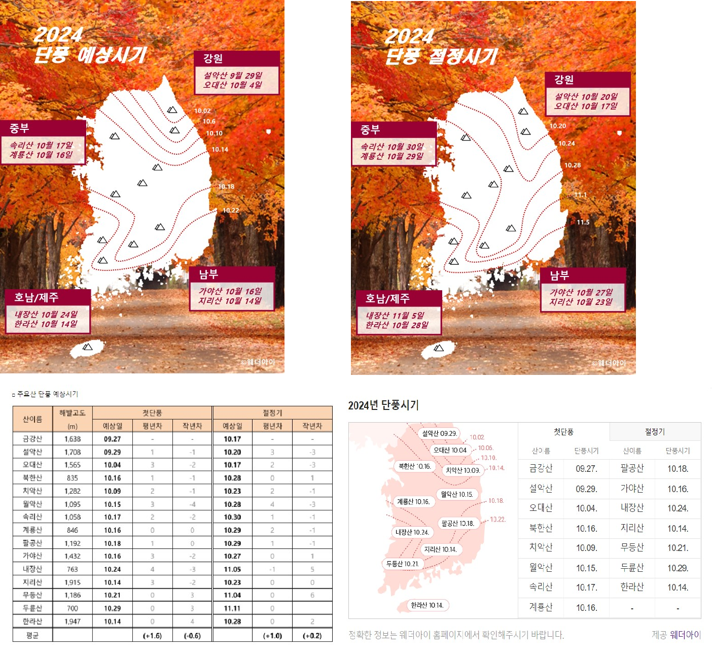 9월29일 설악산에서 첫 단풍 시작해서 단풍 절정은 설악산 10월 20일, 내장산은 11월 5일로 단풍 절정은 평년보다