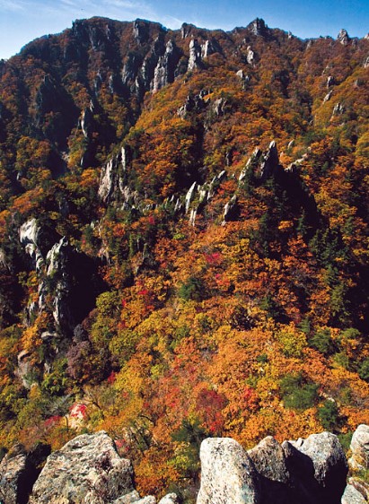 설악산의 특징인 웅장한 기암절벽과 붉다 못해 새빠알간색으로 물든 단풍이 계곡과 산천지를 뒤엎으면