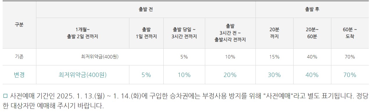 ▶ 위약금 : 승차권 노쇼 방지를 위한 평상시 대비 강화된 위약금 적용