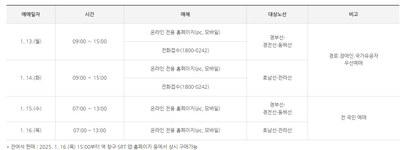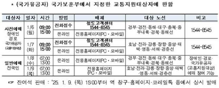 장애인, 경로, 국가유공자 회원 설 승차권 예매 • 1월 6일(월) 9~15시 경부선, 경전선, 동해선(포항) 등 • 1월 7일(화) 9~15시 호남선, 전라선, 강릉선, 중앙선 등