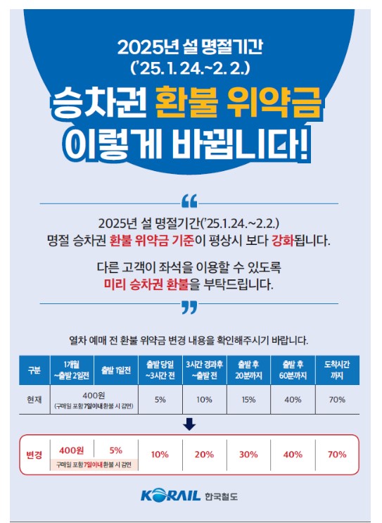 ▶ 2025년 설 명절기간 승차권 환불 위약금 안내