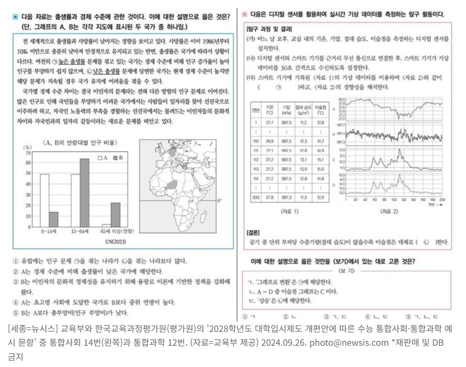 한국의 2028년 대학수학능력시험(수능)은 사회과와 과학을 통합한 새로운 구조를 도입할 예정입니다. 최근 교육부와 한국교육과정평가원은 이러한 통합 영역에 대한 예시 문제를 공개했습니다. 2028년에 첫 번째 학생 집단이 새로운 시험을 치르게 되면서 잠재적인 어려움과 사교육에 대한 의존도 증가에 대한 우려가 커지고 있습니다.